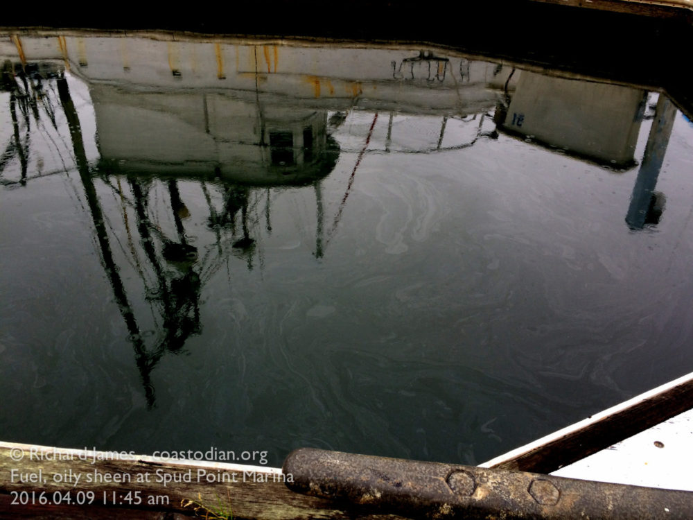 IMG_4500 Published April 25, 2016 at 1000 × 750 in Respect Bodega Bay – washing boats and growing shellfish at Spud Point Marina Oily sheen on the water at Spud Point Marina, Bodega Bay ©Richard James – coastodian.org