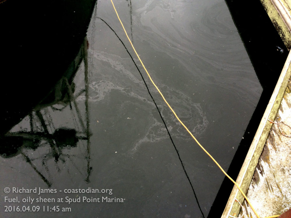 IMG_4502 Published April 25, 2016 at 1000 × 750 in Respect Bodega Bay – washing boats and growing shellfish at Spud Point Marina Oily sheen on the water at Spud Point Marina, Bodega Bay ©Richard James – coastodian.org