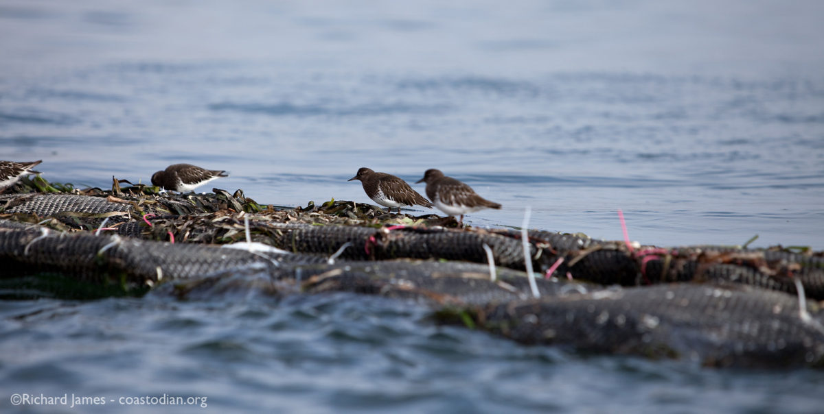 IMG_5503.crop.cc.cw Published December 8, 2013 at 1200 × 604 in Save our Tomales Bay – part 10 Black turnstones foraging atop oyster grow-out bags, Tomales Bay