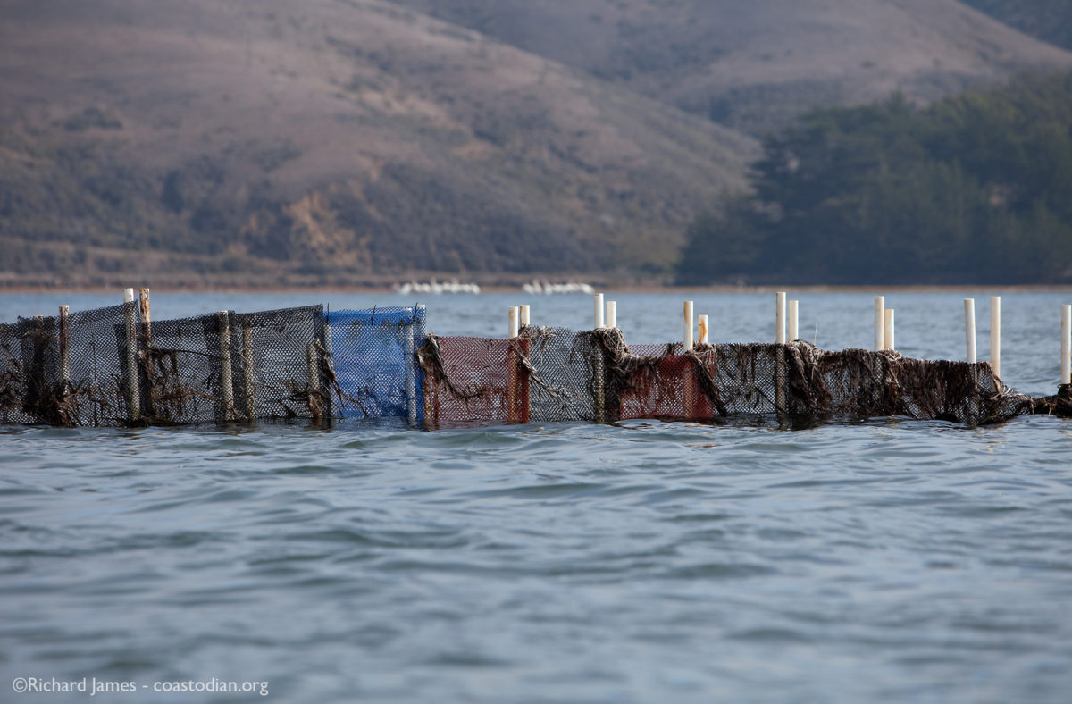 Human-built structure trying to tell the tide where to go with polyethylene bags fastened to polyvinyl chloride (PVC) pipes with nylon cable-ties. Tomales Bay