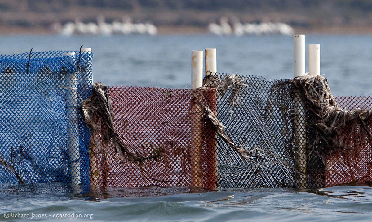Human-built structure trying to tell the tide where to go with polyethylene bags fastened to polyvinyl chloride (PVC) pipes with nylon cable-ties. Tomales Bay. The white objects in the background are American white pelicans made of feathers, flesh and bone.