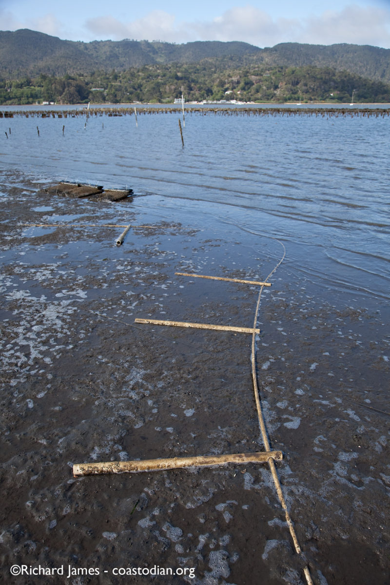 ©RJames.IMG_8287.cc.cw Published May 6, 2014 at 800 × 1200 in Save our Tomales Bay – part 15 Tomales Bay Oyster Company stuck in the mud, along with all their trash abandoned oyster rack gear – Tomales Bay Oyster Company