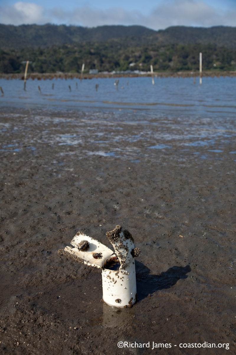 ©RJames.IMG_8289.cc.cw Published May 6, 2014 at 800 × 1200 in Save our Tomales Bay – part 15 Tomales Bay Oyster Company stuck in the mud, along with all their trash abandoned oyster rack mount covered with marine growth – Tomales Bay Oyster Company