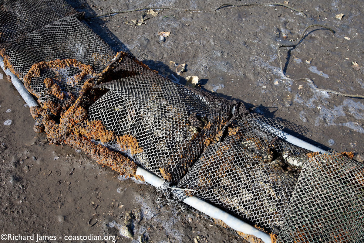 ©RJames.IMG_8297.cc.cw Published May 6, 2014 at 1200 × 800 in Save our Tomales Bay – part 15 Tomales Bay Oyster Company stuck in the mud, along with all their trash abandoned grow out bags covered with marine growth – Tomales Bay Oyster Company
