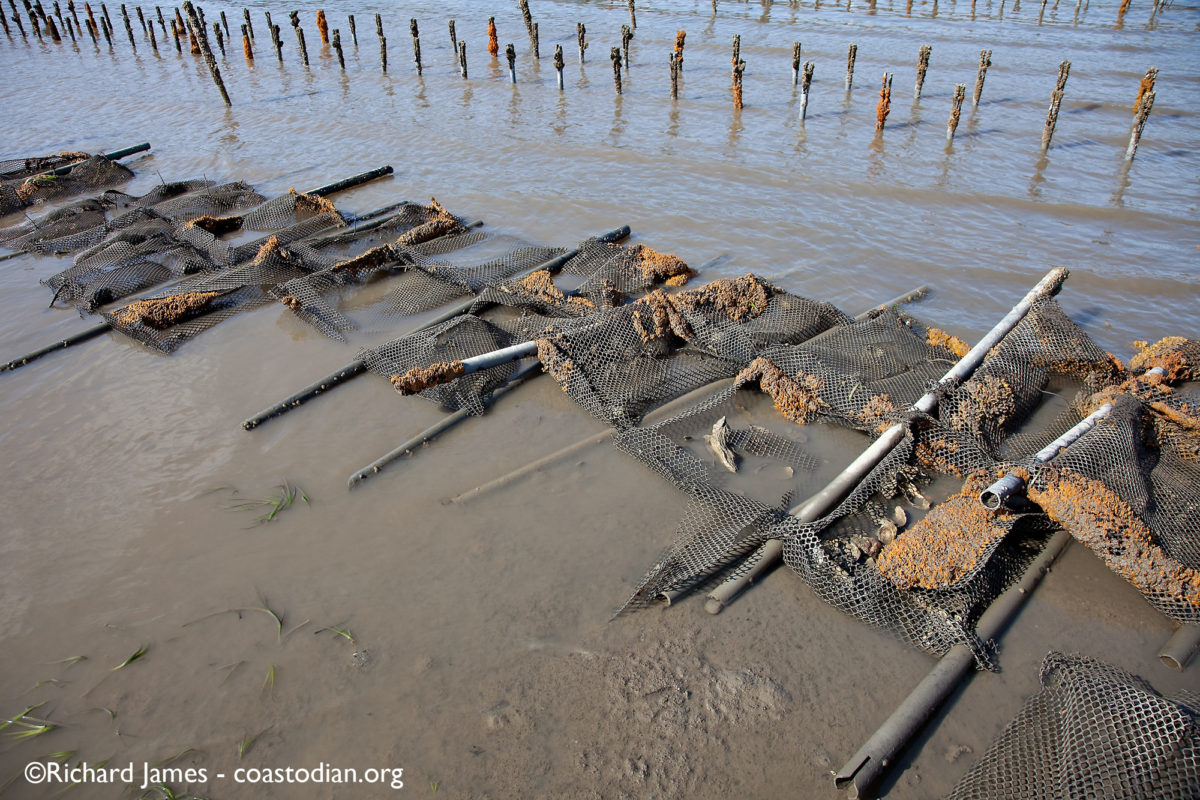 ©RJames.IMG_8311.cc.cw Published May 6, 2014 at 1200 × 800 in Save our Tomales Bay – part 15 Tomales Bay Oyster Company stuck in the mud, along with all their trash abandoned grow out bags covered with marine growth – Tomales Bay Oyster Company