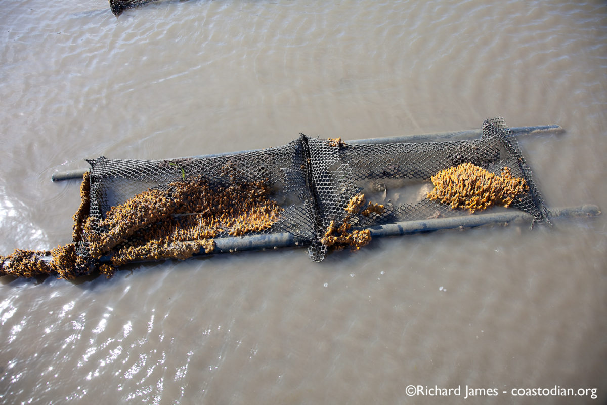 ©RJames.IMG_8312.cc.cw Published May 6, 2014 at 1200 × 800 in Save our Tomales Bay – part 15 Tomales Bay Oyster Company stuck in the mud, along with all their trash abandoned grow out bags covered with marine growth – Tomales Bay Oyster Company