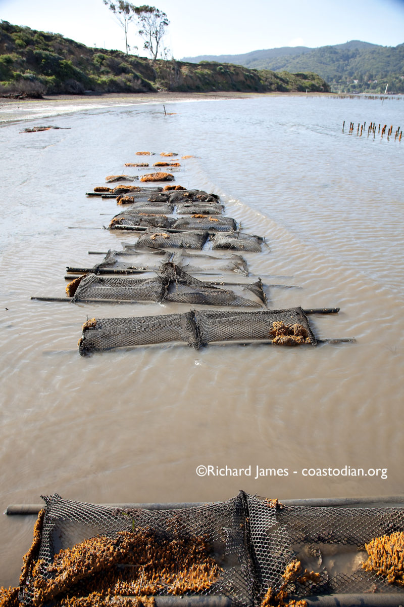 ©RJames.IMG_8313.cc.cw Published May 6, 2014 at 800 × 1200 in Save our Tomales Bay – part 15 Tomales Bay Oyster Company stuck in the mud, along with all their trash abandoned grow out bags covered with marine growth – Tomales Bay Oyster Company