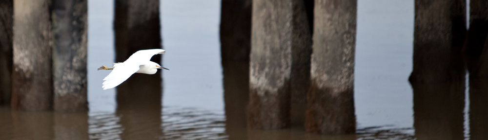 A snowy egret glides over the Petaluma River in search of food or a place to rest. Behind the egret is the Black Point Bridge, a 250′ thru-swing-truss, built in 1911.